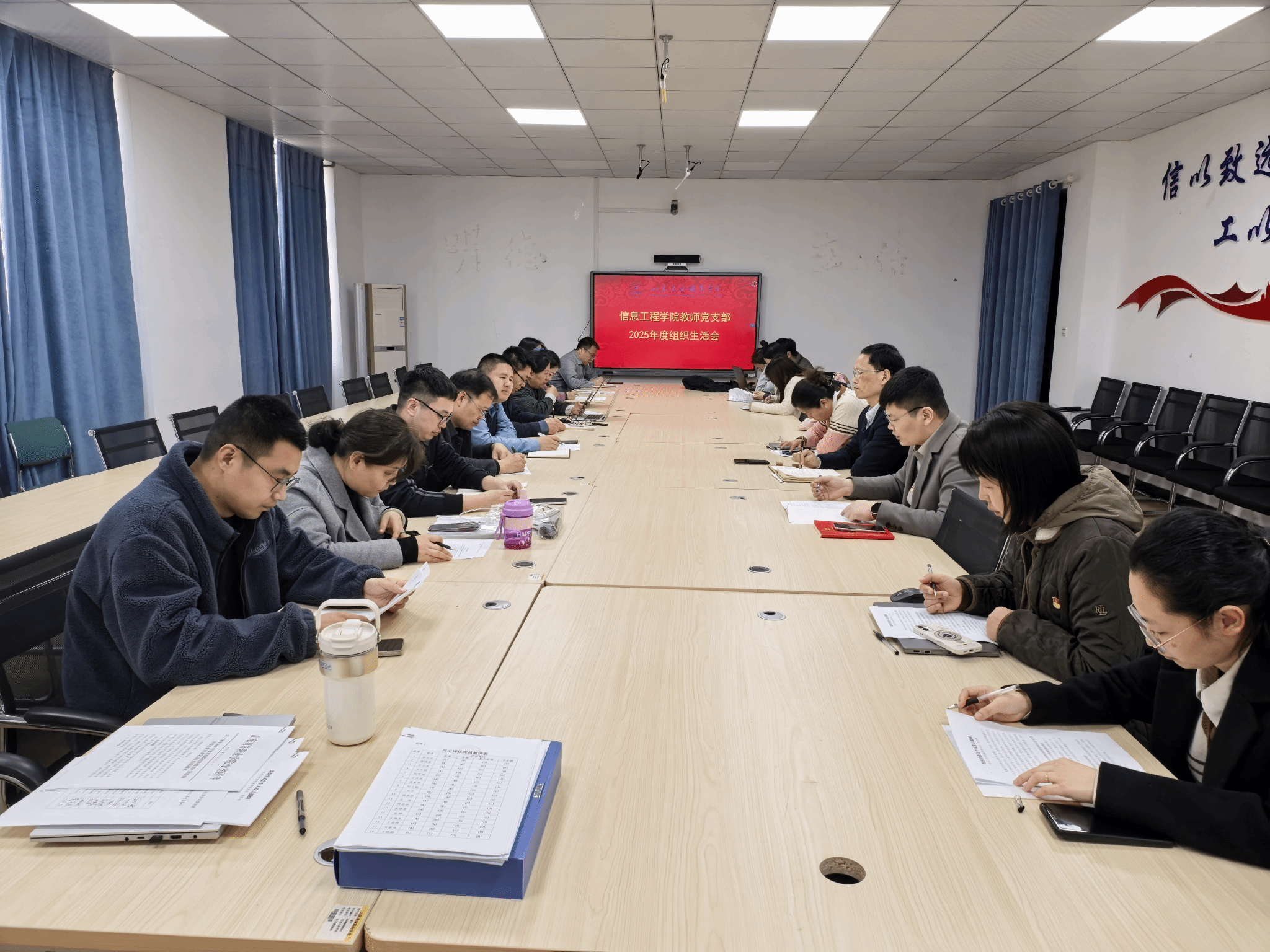 3月23日下午,信息工程学院教师党支部召开2025年度组织生活会,开展民主评议党员活动。会议由党支部书记郭纪良同志主持,全体党员参会。学院党总支书记王九福同志列席指导。