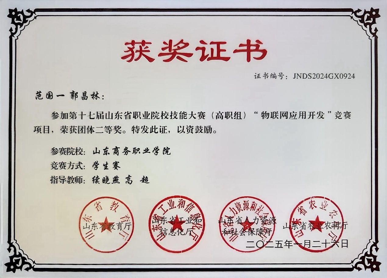 近年来,本专业学子在山东省职业院校技能大赛“物联网应用开发”赛项、“互联网+”创新创业大赛、“挑战杯”大学生创业计划竞赛、“技能兴鲁”技能竞赛等高水平赛事中斩获金奖2项、银奖3项,二等项4项。专业教师主持及参与省级及以上教科研课题8项,出版教材6本,获得发明专利、实用新型专利授权5项。在教师竞赛中斩获山东省青教赛一等奖、山东省职业院校教学能力大赛一等奖、“技能兴鲁”竞赛教师组一等奖第一名。
