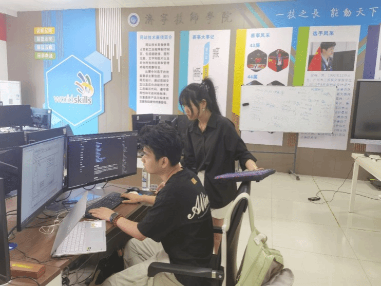在第三届全国职业技能大赛网站技术赛项国赛山东省选拔赛临近之际,为了能够在国赛选拔赛中取得更好成绩,近日,指导老师带领参赛学生赴济宁市技师学院进行赛前集训。集训前,济宁技师学院信息工程学院师生与我校师生进行了深入座谈,并介绍了本次集训的内容。集训紧扣赛事核心,以“理论+实践+研讨”的形式开展,通过专题讲座深度解读大赛赛程、规范标准与评分细则。参赛学生在项目实践训练中模拟真实赛况,锤炼实操技能。此外,还有开放式问题研讨环节,针对比赛各环节难点展开深度剖析与经验共享。