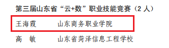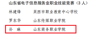 “山东省技术能手”每年评选一次,由跨地区、跨行业的全省技能竞赛或有关行业牵头举办的全省范围技能竞赛产生,入选人员技能水平在本职业(工种)位居前列,能在技术创新、攻克技术难关等方面做出突出贡献。孙琳老师参加山东省电子信息服务业职业技能竞赛数字化管理师工种赛项、王海霞老师参加第三届山东省“云+数”职业技能竞赛云计算赛项,二人均获得职工组一等奖第一名,充分展示了商务教师刻苦钻研技术,苦练技能本领,立足专业服务全省经济社会高质量发展的责任与担当。