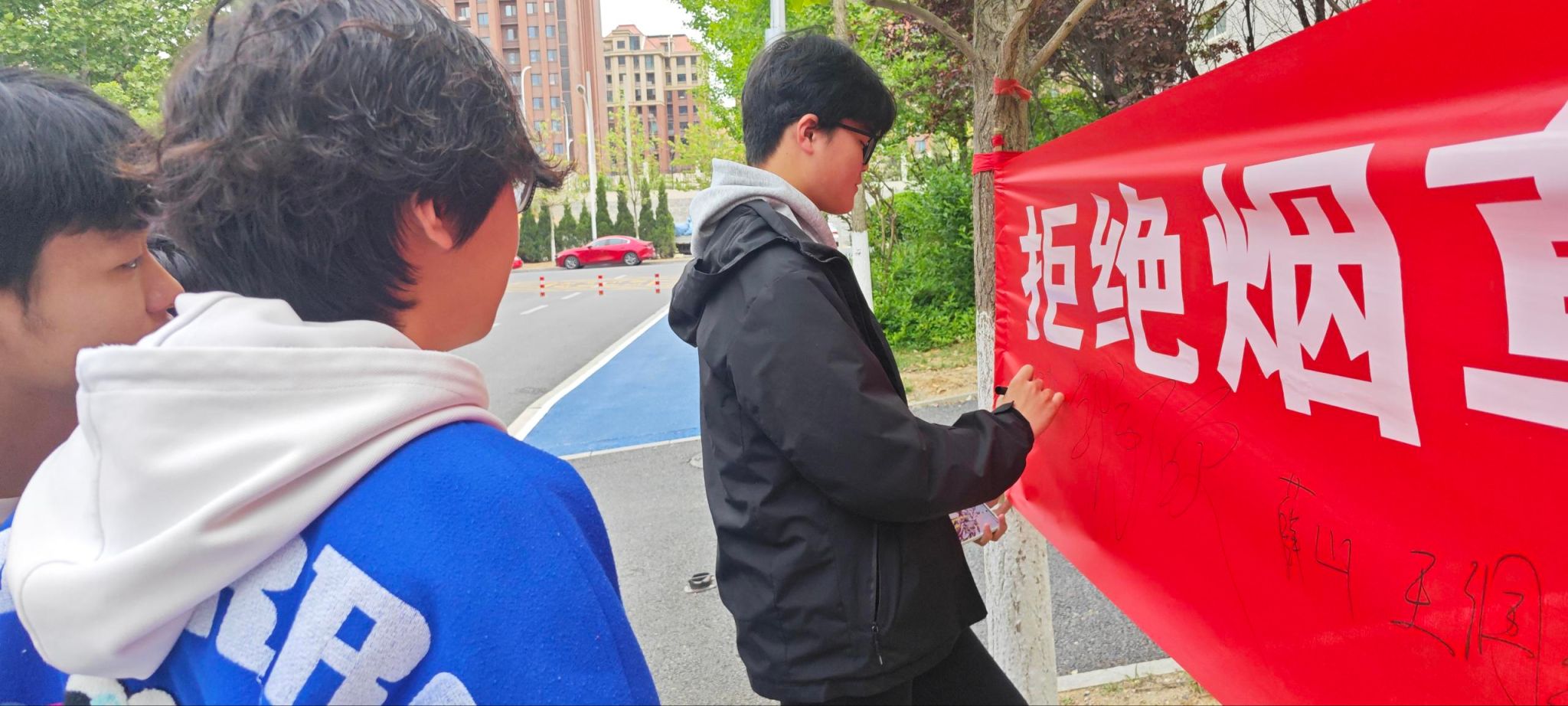 签字活动,共筑无烟校园。学院还开展了一场以“守护健康,对烟草说不”为主题的横幅签字活动。活动现场,学生志愿者向同学们科普了吸烟的危害,宣传无烟校园建设的重要意义。同学们纷纷停下脚步,郑重地签下自己的名字并表明自己愿为无烟校园出一份力量。“签名承诺,无烟同行,共筑健康和谐校园”,这句标语醒目地展示在横幅上,也深深地印在了每一位同学的心中。本次活动也充分呼吁大家不仅要为自己的健康负责,也要为身边的人创造一个无烟的环境。