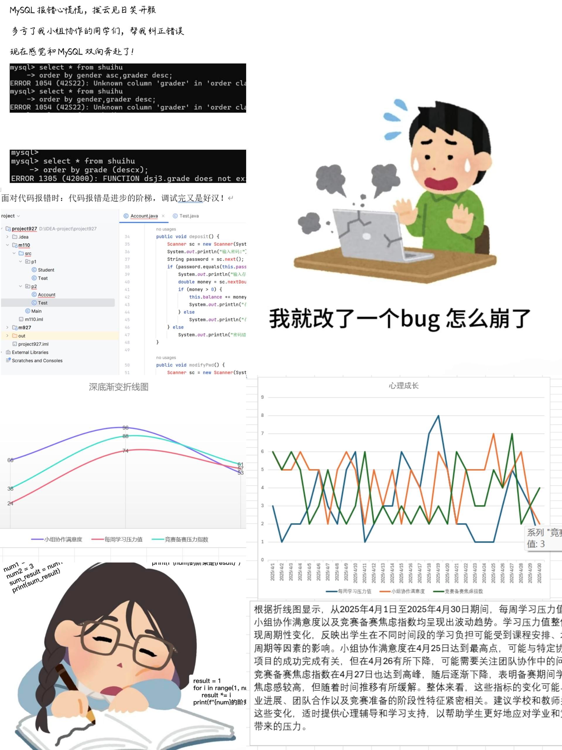 “数据心轨・成长折线图”心理数据可视化工作坊。学院组织同学们以“我的心理成长”为主题,自主设计关于竞赛备赛焦虑指数数据维度。同学们积极记录近一个月的个人心理状态数据,制作可视化图表,它恰似一幅精细入微的心灵剖析图,提供了科学认知心理状态的创新平台,为促进同学们的心理健康发展起到了推动作用。