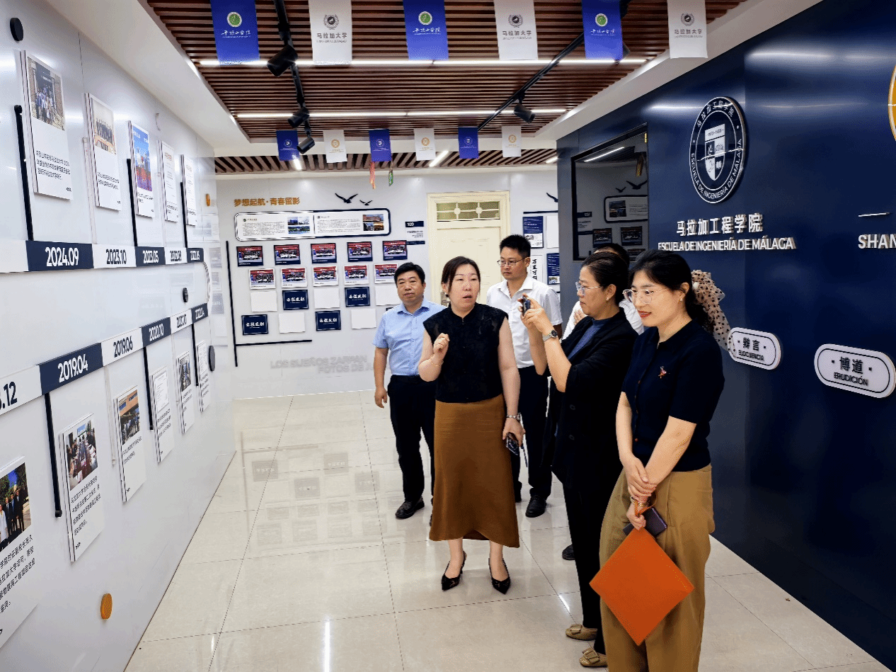 调研团队实地参观了平顶山学院马拉加工程学院书院,重点考察了双语实验室、西语角、留学生服务中心等特色场所。在实验室,双方就“中外合作项目中的实践课程衔接”问题进行交流,平顶山学院展示的“西班牙教授线上指导+本地工程师现场实训”模式引发关注。在学生活动中心,墙上陈列的“西班牙科技创新大赛获奖作品”“中西方文化对比海报展”等,直观呈现了合作项目的融合成果。