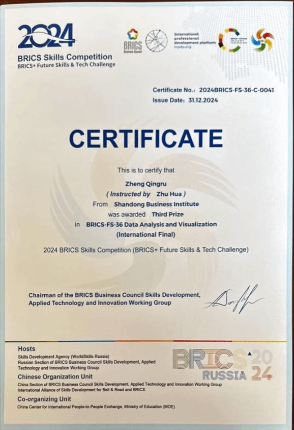 近日,我校信息工程学院参赛选手郑庆儒凭借扎实的专业技能和出色的发挥,荣获 2024 金砖国家职业技能大赛数据分析与可视化赛项国际总决赛三等奖。