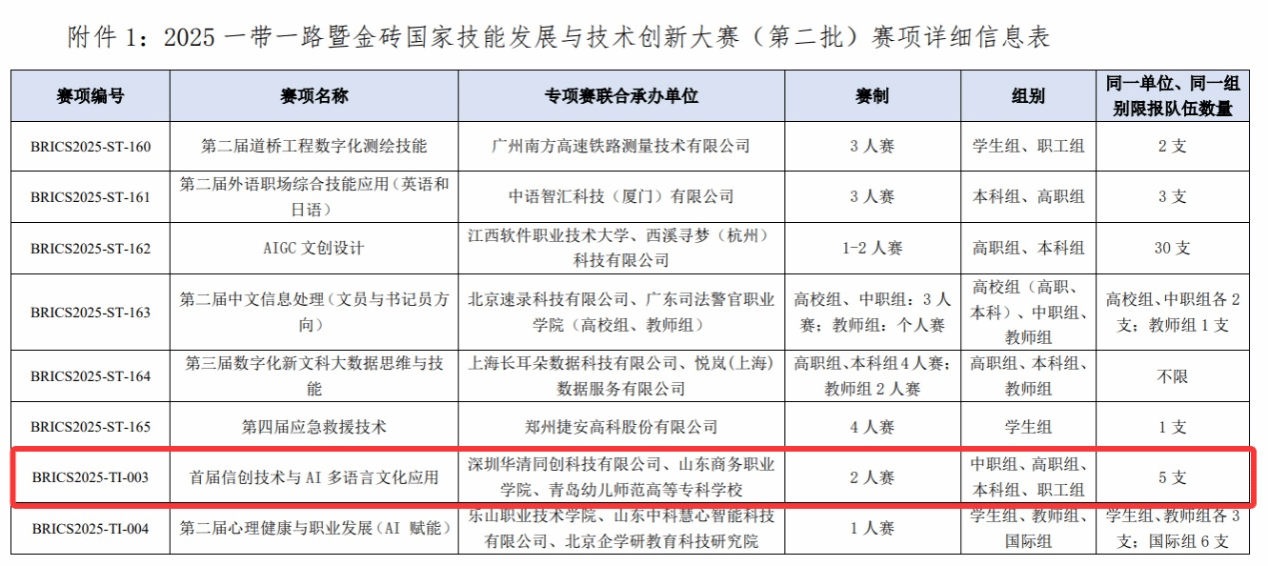 根据近期公布的《关于2025第九届一带一路暨金砖国家技能发展与技术创新大赛(第二批)赛项参赛报名及征集专项赛联合承办院校的通知》,我校与深圳华清同创科技有限公司、青岛幼儿师范高等专科学校联合申报的“首届信创技术与AI多语言文化应用”赛项获批。