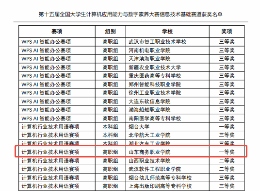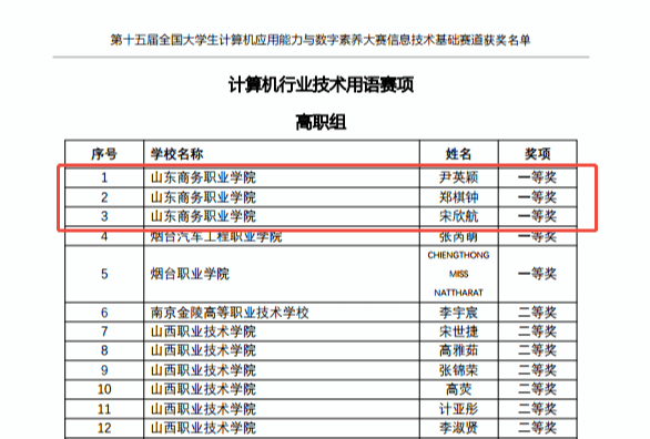我校尹英颖、郑棋钟、宋欣航三名同学斩获“计算机行业技术用语赛项”(高职组)一等奖前三名,同时,我校也获得该赛项团体一等奖。