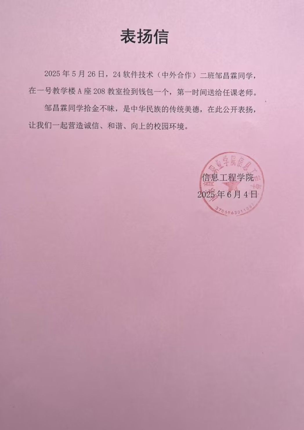近日,2024级软件(中外合作)2班邹昌霖同学在教学楼1A208教室拾获一个内含现金及重要证件的钱包。面对意外之财,邹昌霖同学没有丝毫犹豫,第一时间将钱包上交至任课老师,以便尽快寻找失主。无独有偶,24级大数据1班王学喆同学在3号宿舍楼B区3楼卫生间内发现一部被遗落的手机。王学喆同学同样选择了最直接有效的方式——迅速将手机交予社区工作站。在学院老师的积极协助与核实下,两件失物均以最快速度物归原主,解除了失主的焦虑与不便。