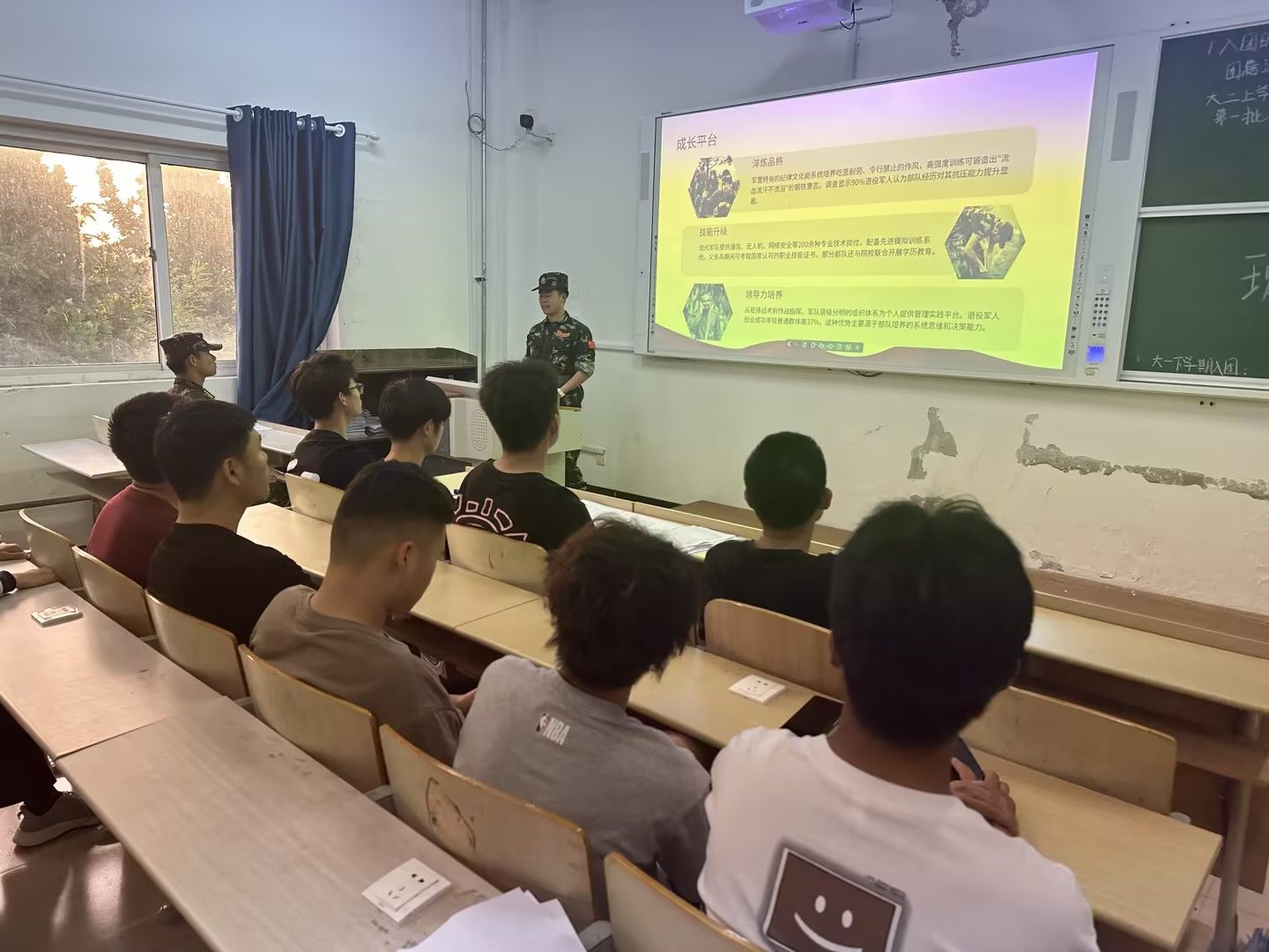 活动现场,退役复学学生靳坤龙等结合亲身经历,生动讲述军旅故事。他们讲述部队严苛训练、特殊任务执行,展现艰苦环境中磨砺出的坚韧意志。随后,宣讲团细致解读征兵政策,鼓励青年学生入伍报国,并介绍入伍资助福利。同时,结合专业特色,分析参军对职业发展的助力。在互动环节,同学们围绕体检标准、部队发展路径等积极提问,尽显对军营生活的浓厚兴趣。