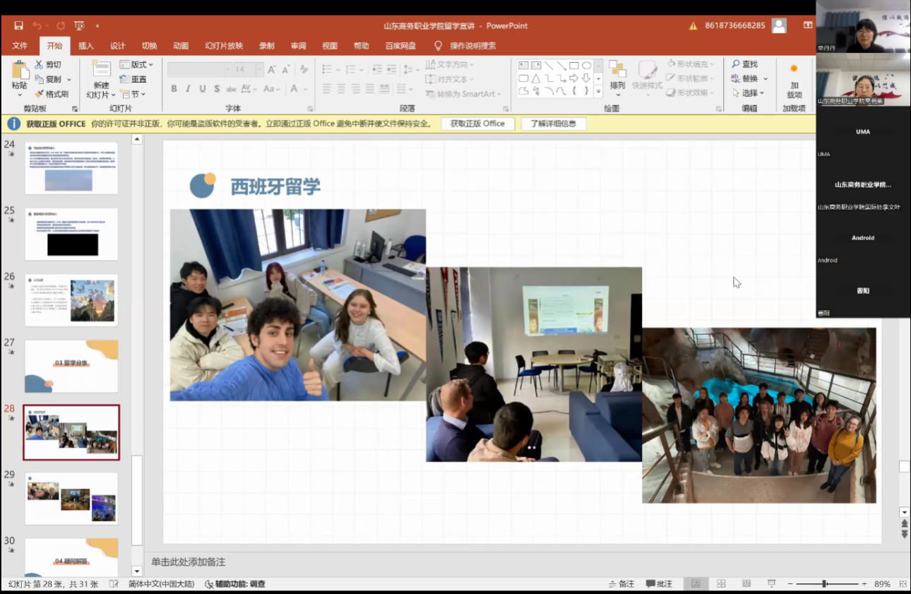 宣讲活动中,西班牙马拉加大学国际事务处主任Juan Carlos、马拉加大学国际事务处中国学术项目负责人李璐、马拉加大学中国办公室留学部主任曹阳、我校国际教育学院科长李文叶、软件技术专业负责人辛丹丹分别对西班牙国际交流项目进行了解读,并详细介绍了项目的课程设置、师资力量、研学安排等,引起了学生和家长的关注。