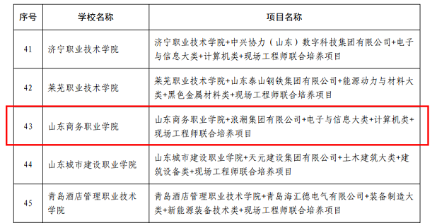近日,山东省教育厅公布了山东省第二批现场工程师专项培养计划项目名单,我校由信息工程学院牵头申报的“山东商务职业学院+浪潮集团有限公司+电子与信息大类+计算机类+现场工程师联合培养项目”成功入选。
