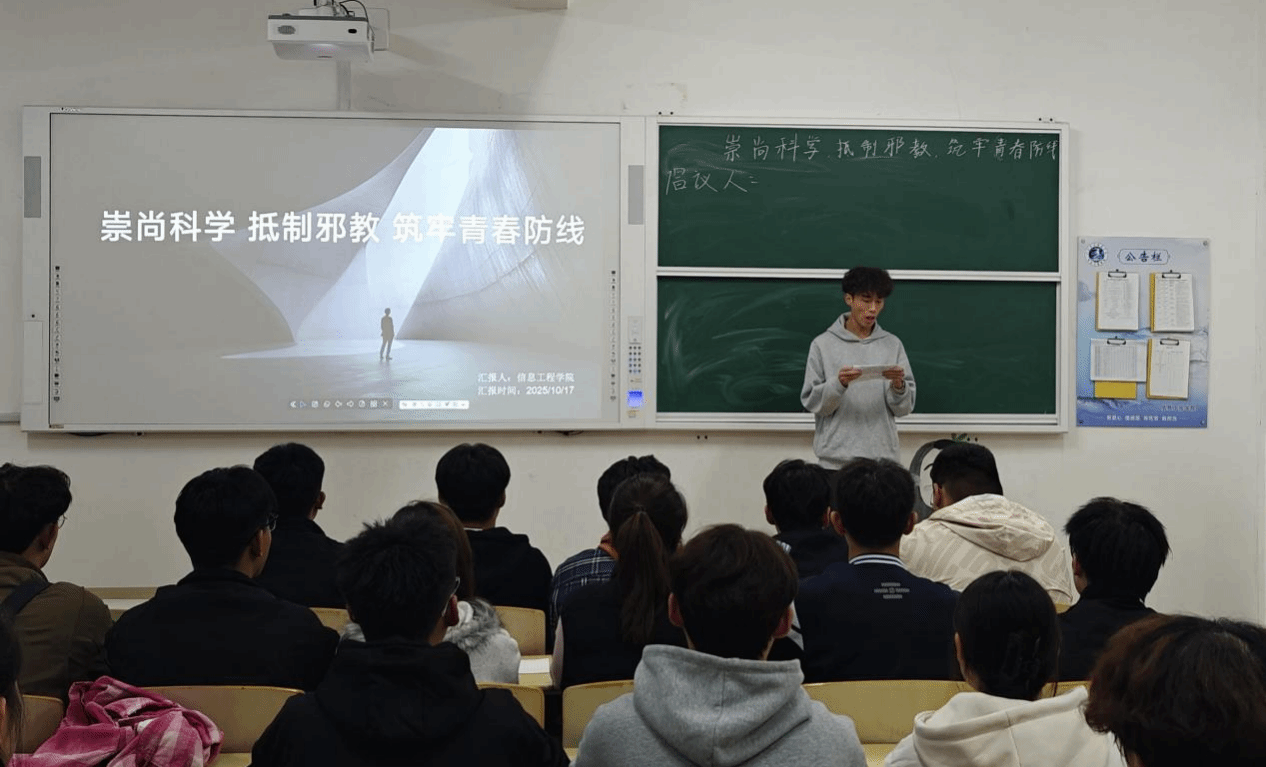为进一步净化校园环境,强化学生思想引领,提升青年学子对邪教组织的辨别能力和抵制意识,10月14日至19日,信息工程学院围绕“崇尚科学,抵制邪教,筑牢青春防线”主题,组织开展了系列教育活动,引导学生树立科学观念,守护校园意识形态安全。