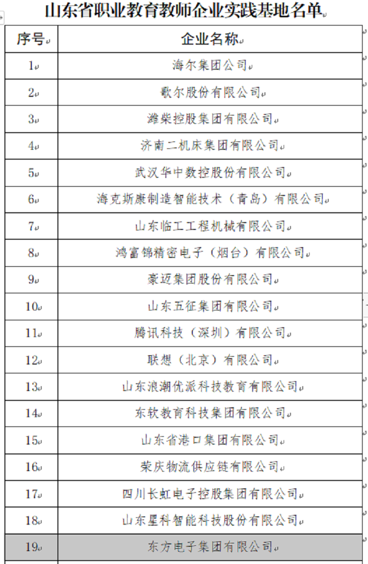 近日,山东省教育厅、山东省发改委、山东省工信厅、山东省国资委、国家税务总局山东省税务局等五部门联合下发《关于公布山东省职业教育教师企业实践基地的通知》(鲁教师函〔2023〕5号),确定海尔集团公司等49家企业为山东省职业教育教师企业实践基地,我校信息工程学院推荐的校企合作单位东方电子集团成功入选。